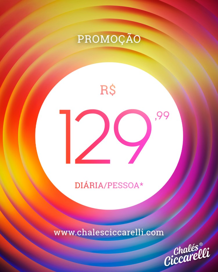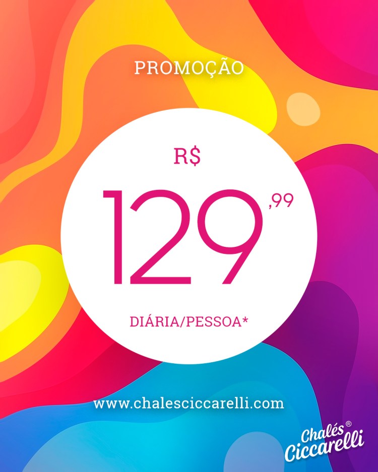 Diária de R$ 129,99 por pessoa. Locação mín. de 2 dias, 1 criança de até 5 anos de cortesia, crianças até 10 anos pagam meia diária.